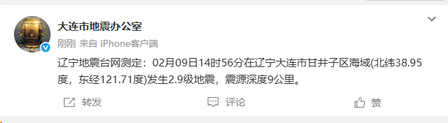 辽宁地震台网测定:2月9日14时56分在辽宁大连市甘井子区海域(北纬38.95度,东经121.71度)发生2.9级地震,震源深度9公里。
