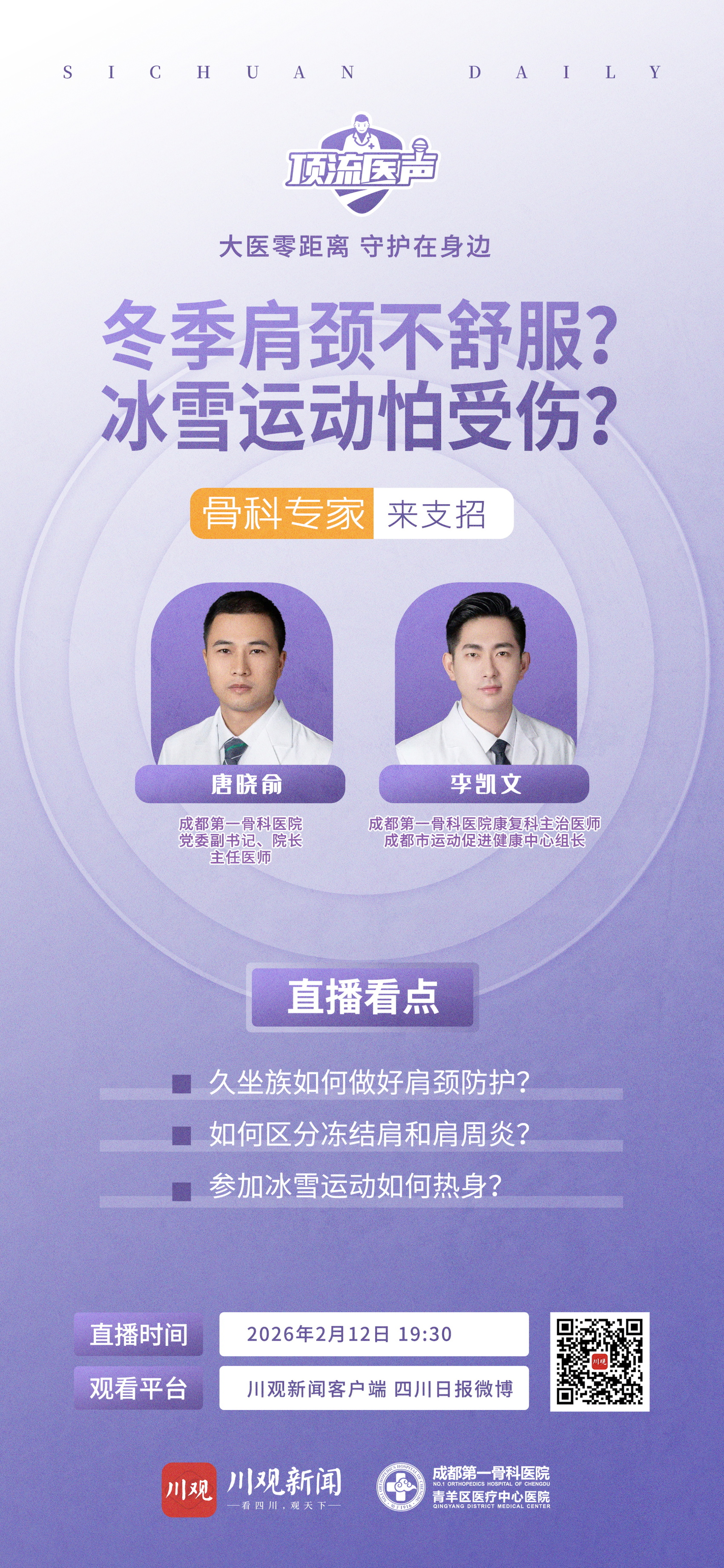 2月12日,川观新闻携手成都第一骨科医院开展健康主题直播,聚焦冬季肩颈护理与冰雪运动损伤防护两大话题,为大家带来专业、实用的健康指导。