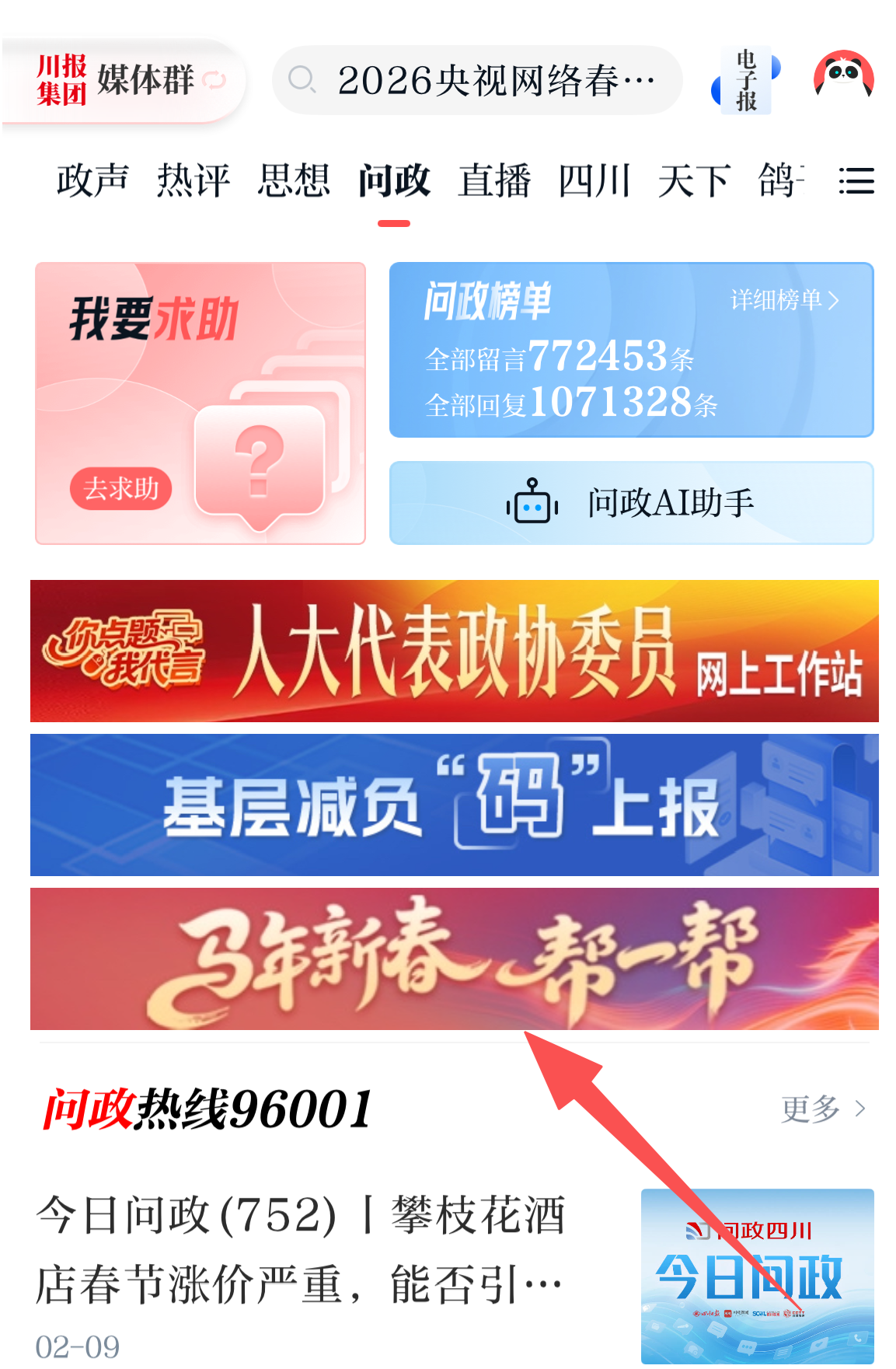 ♦打开微信搜索“问政四川”小程序,点击“马年新春帮一帮”即可参与留言;