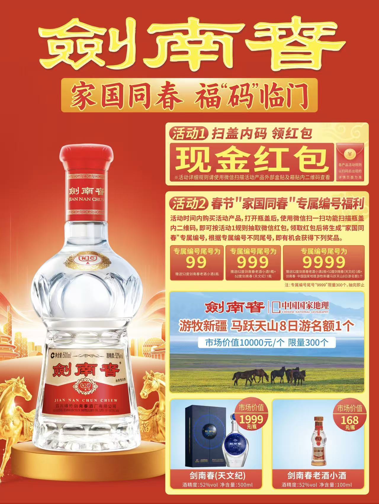 在福利端,“家国同春·福‘码’临门”活动覆盖水晶剑南春、珍藏级剑南春等核心产品,100%中奖率点燃消费热情,幸运用户可赢取剑南春老酒小酒、剑南春·天文纪,更有新疆8日游限量福利;同步推出剑南春老酒“扫码满2瓶赠小酒”活动,强力助推核心产品复购。
