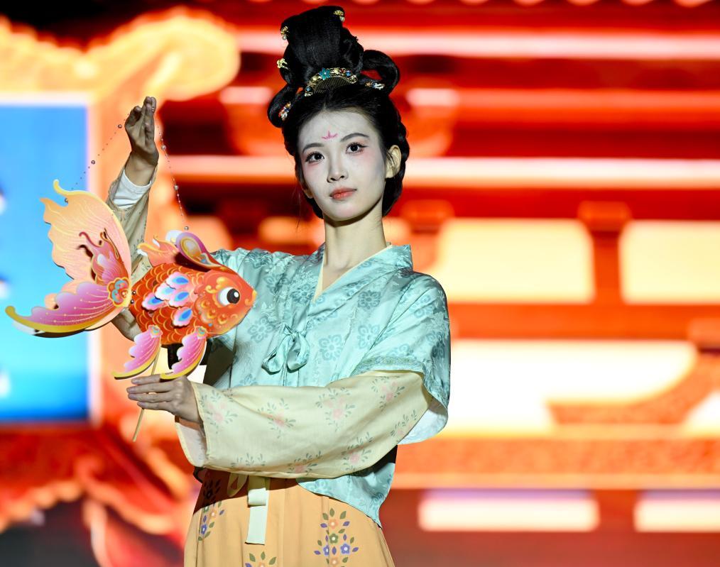 在河南省洛阳市洛邑古城,演员身着华服走秀。新华社记者郝源 摄