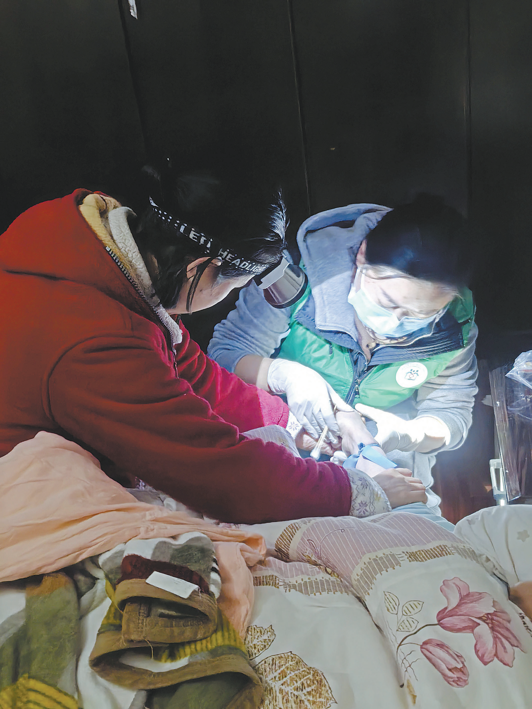 成都市龙泉驿区仁爱社区卫生服务中心家庭医生清晨入户,借着头灯为瘫痪老人采血。(冯舒影 摄)