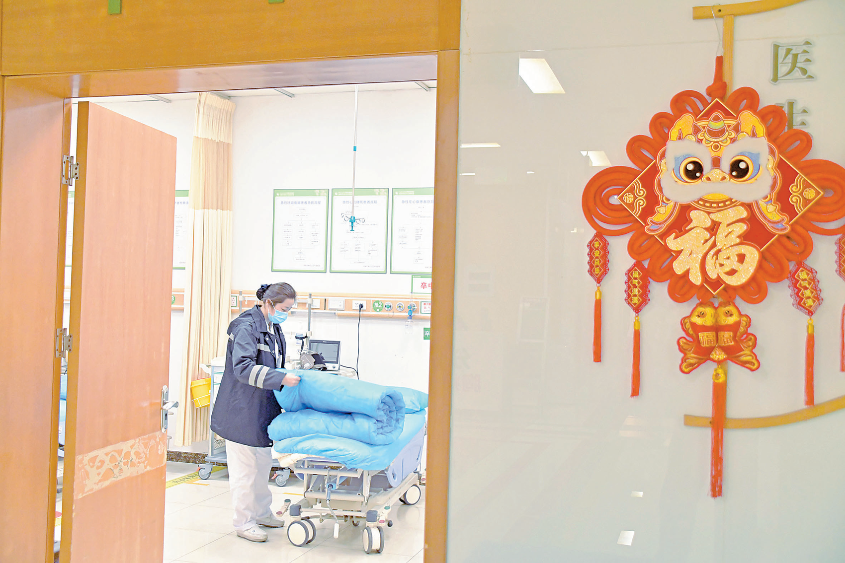 成都市青白江区中医医院急诊室,医护人员整理病床。(陈岚 摄)
