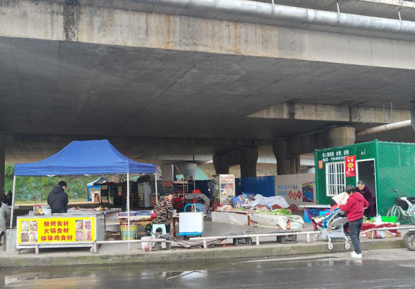彼时,地处社区中心的乐(山)雅(安)高速张徐坝互通桥下,自发形成了一个“露天市场”——流动摊贩挑着箩筐,在这里售卖自家种植的蔬菜、水果,看似解决了部分买菜需求,却也带来了新的问题。
