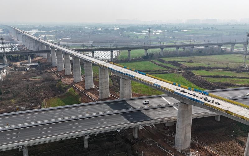 这是2月10日在四川省成都市拍摄的成渝中线高铁最长桥梁龙泉特大桥跨成巴高速公路(无人机照片)。