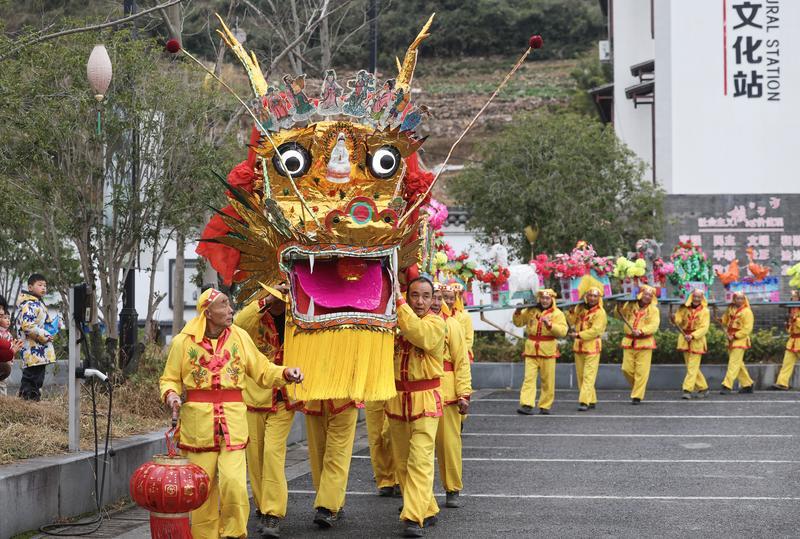2月10日,诸暨市赵家镇赵家社区村民抬着板凳龙在镇综合文化站广场上舞动。
