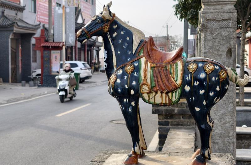 这是2月9日拍摄的河南省洛阳市孟津区三彩小镇路边摆放的唐三彩马。