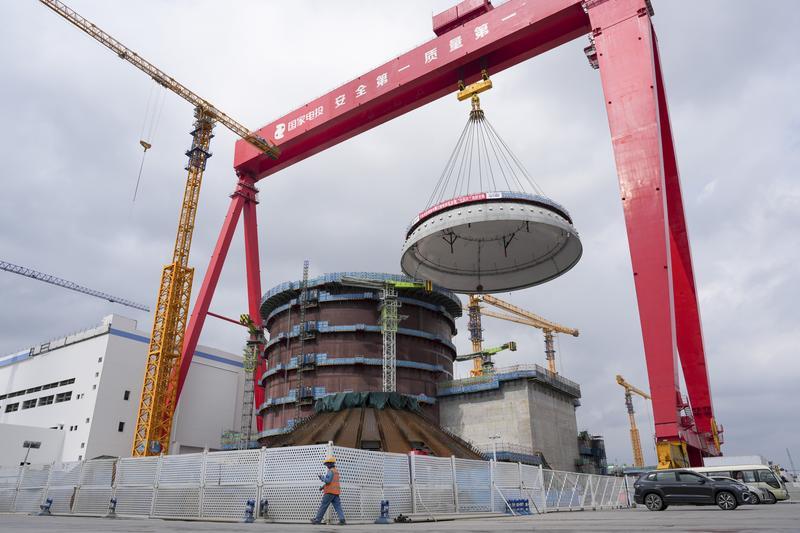 2月10日,广东廉江核电项目1号机组核岛钢制安全壳顶封头在吊装中。