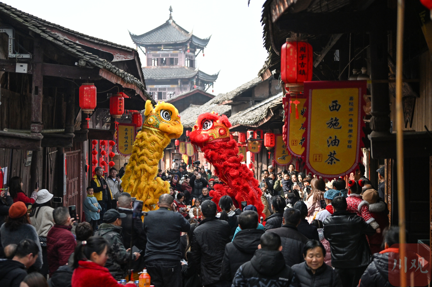 2026年2月10日,在四川省南充市蓬安县周子古镇,返乡游子和乡亲欢聚一堂观看舞狮表演迎新春。