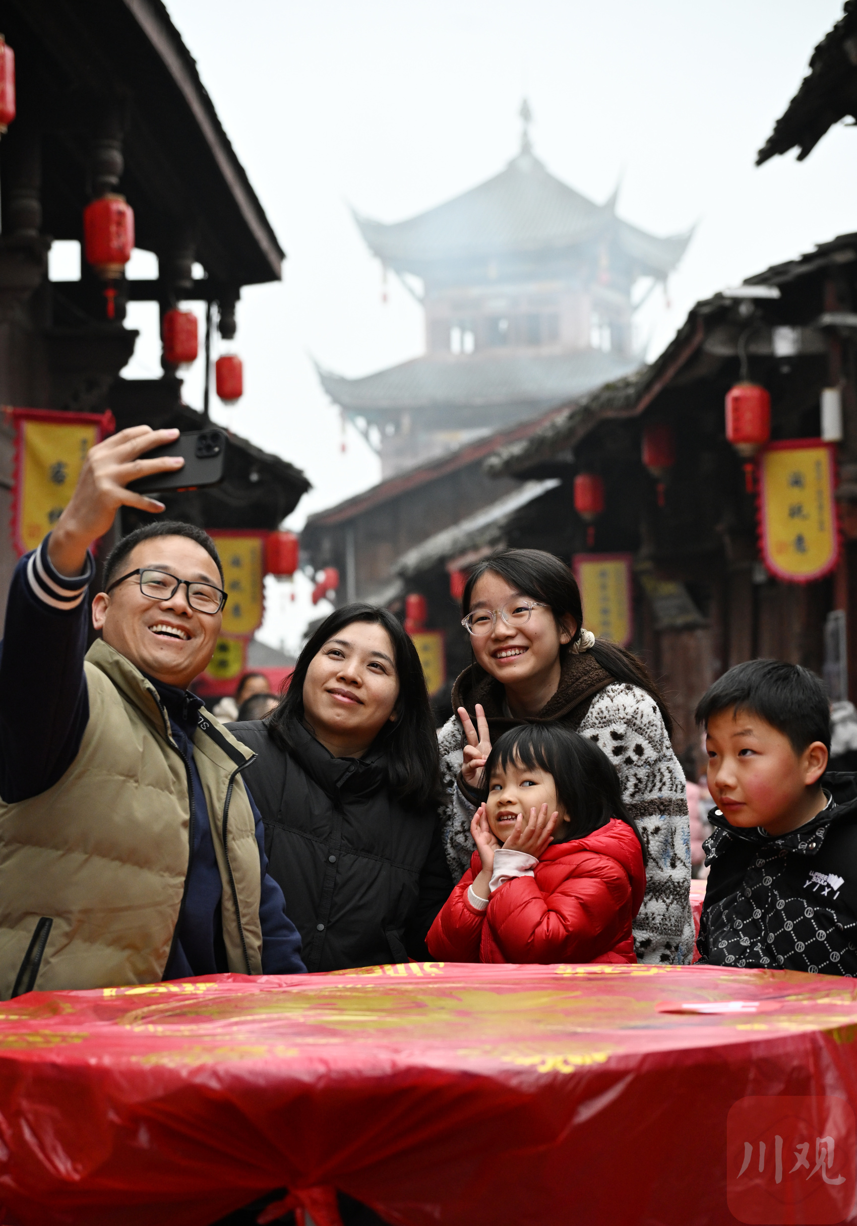 2026年2月10日,在四川省南充市蓬安县周子古镇,从广东返乡的游子在家乡合影留念。