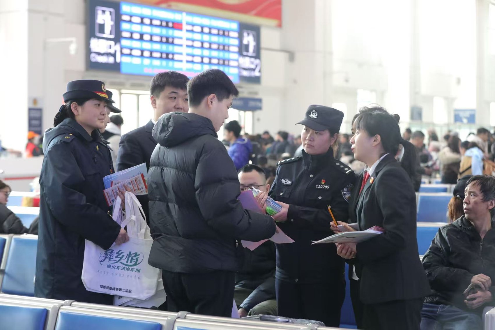 2月10日上午,成都西站候车大厅里人流如织,喧哗声中,一条高悬于主通道的红色横幅格外醒目,上面写着 “法护归途·平安春运”。
