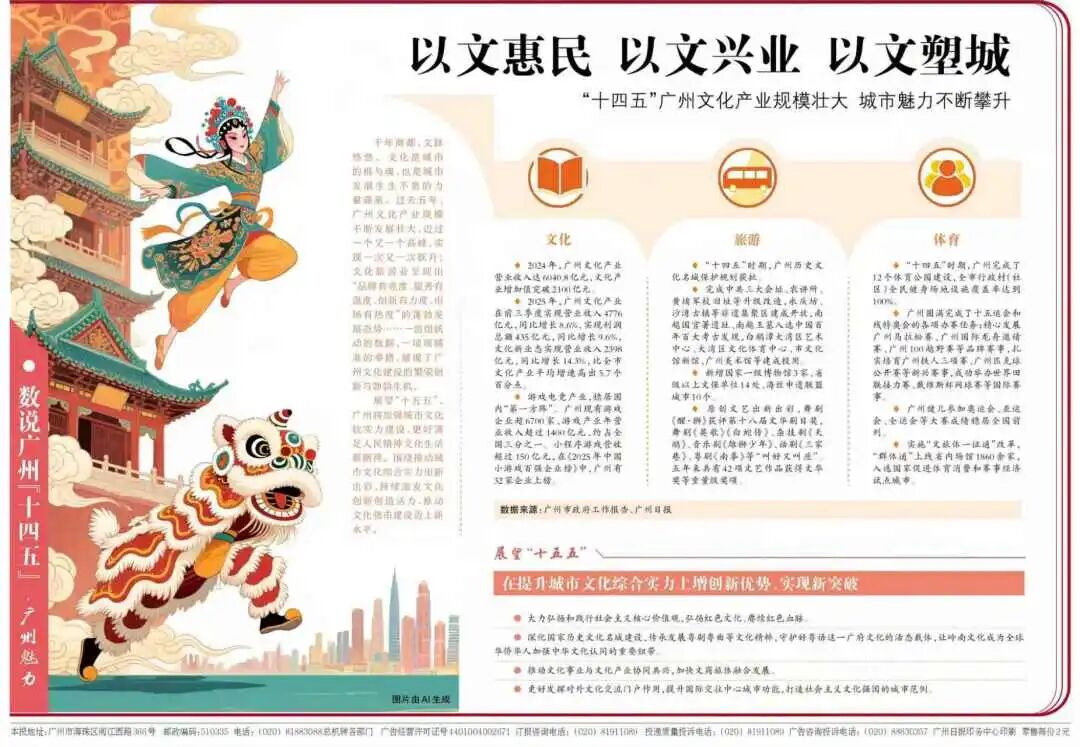 展望“十五五”,广州将加强城市文化软实力建设,更好满足人民精神文化生活新期待。围绕推动城市文化综合实力出新出彩,持续激发文化创新创造活力,推动文化强市建设迈上新水平。