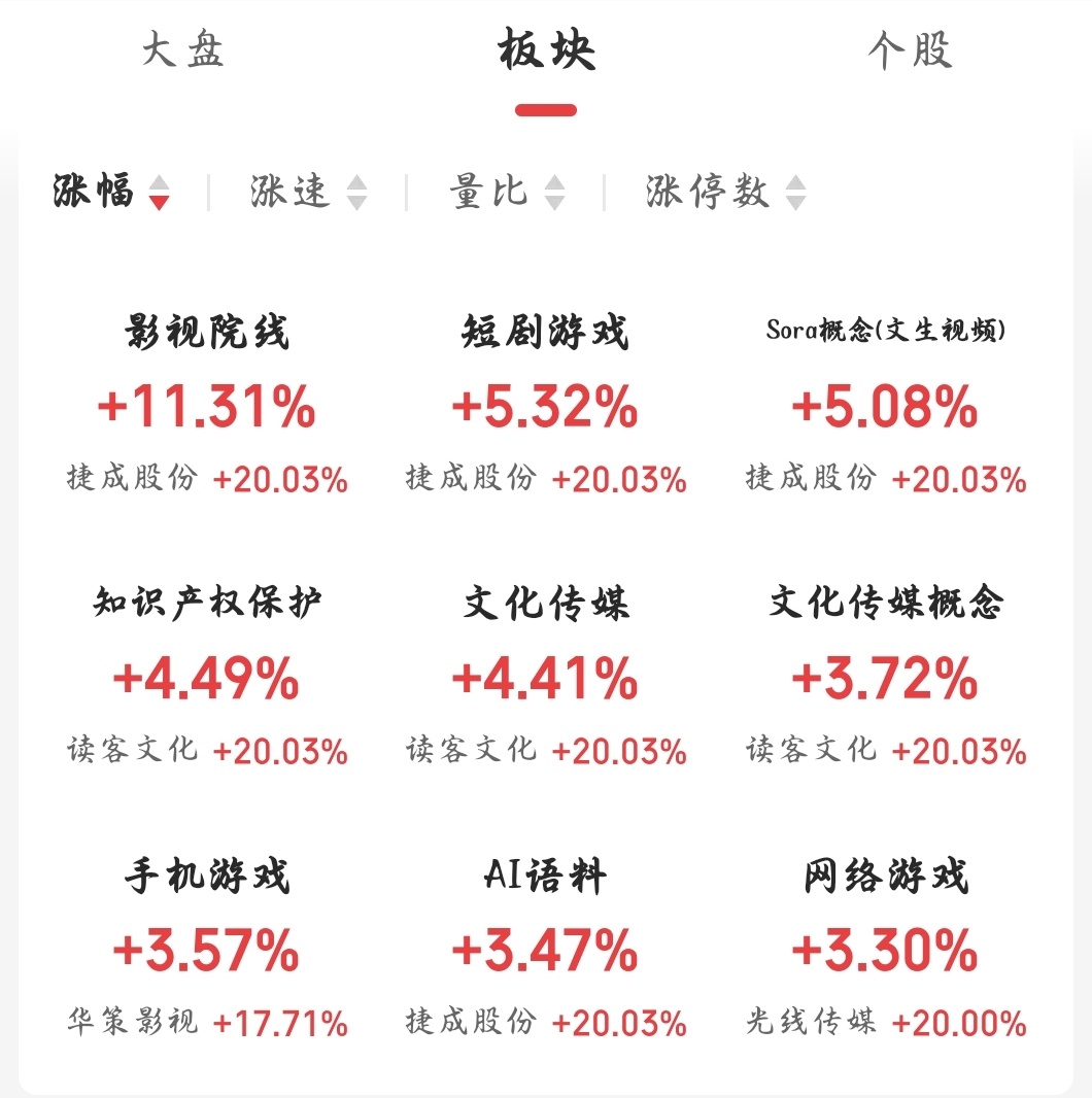 今日盘面九成的资金与人气,抱团在AI应用的主线上。字节跳动Seedance 2.0模型的横空出世,让市场再一次看到了AI从“玩具”变“工具”的样子。于是,传媒、影视院线、短剧游戏板块集体井喷,光线传媒、中国电影、横店影视等权重与人气龙头批量涨停。