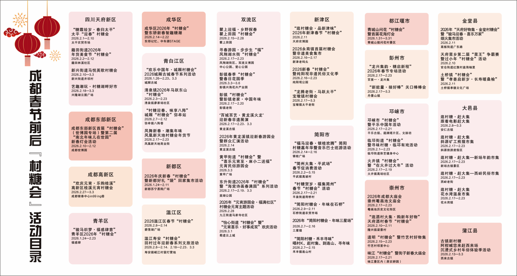 诚邀您循着地图走进各地“村糖会”活动观场,穿梭乡村与街巷,尝美味食品,淘农特好礼,赏非遗展演,赴产销对接,谋投资合作……在浓浓的年味中,体验成都独有的烟火市井与万千气象。