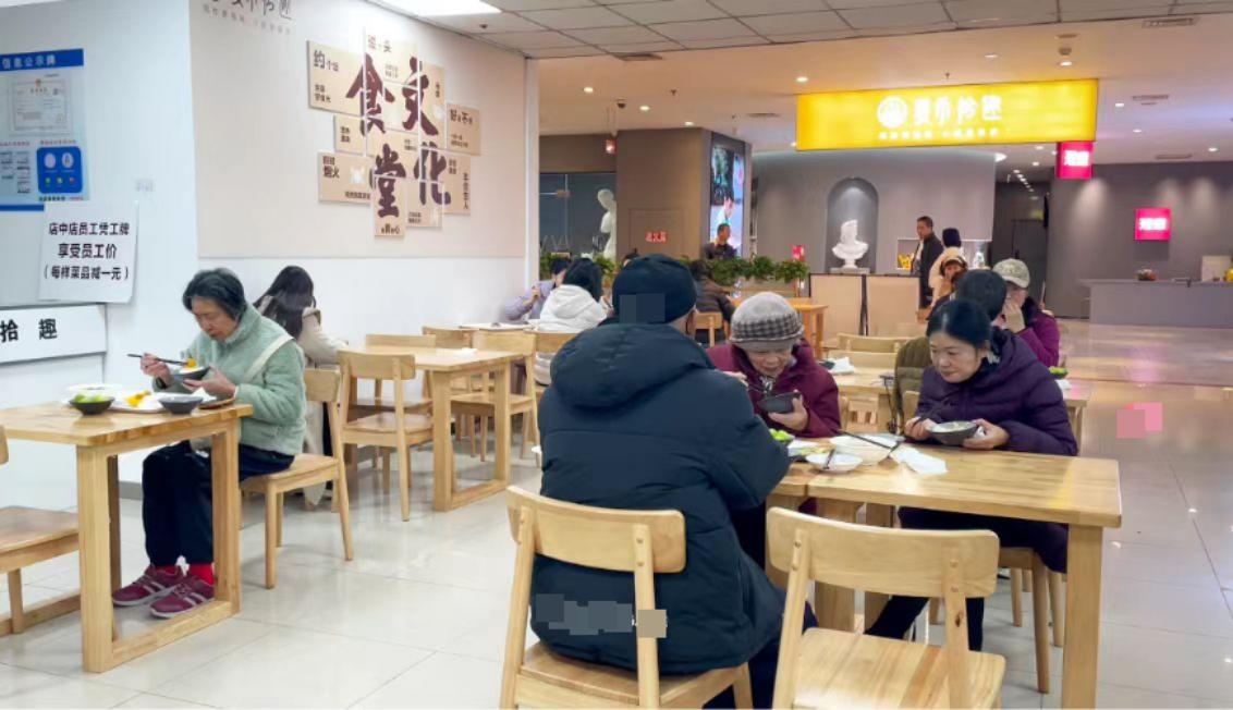 作为成都“蓉颐助餐”服务网络的点位之一,这里被称为“红牌楼街道老年餐桌”,餐厅依托商场中央厨房体系,每日提供现炒小碗菜,老人可自由选择搭配。