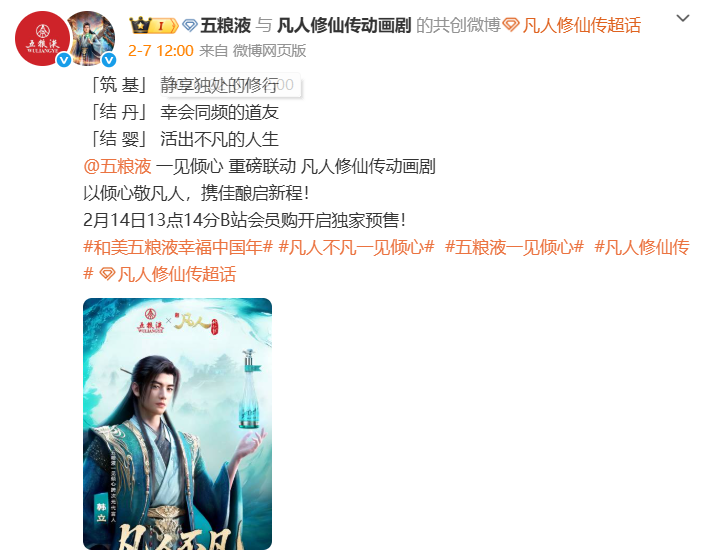 一杯浓香美酒品出中华传统文化的和美之美。春节期间,和美五粮液的“仪式感”,还将在于与年轻人的“浓烈相遇”。据悉,《凡人修仙传》联名掀起小红书、B站国风热潮,持续营造“一见倾心,陪伴凡人修行”的情感共鸣,《29度情人节新春MV》视频将在2月13日重磅发布。同时,五粮液还将在小红书等平台开启创意特调、UGC共创玩法等,与年轻人一起共创和美春节氛围,与全球华人共度马年春节。