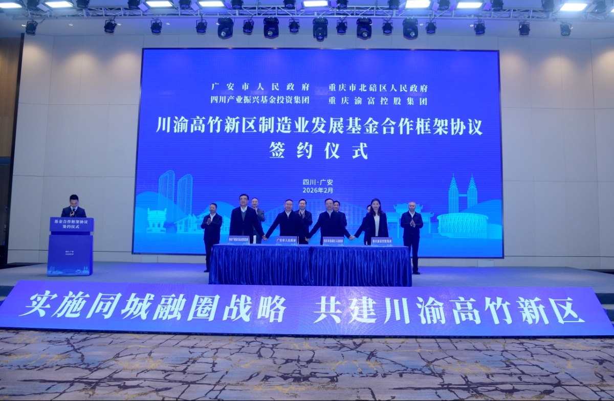 2月10日下午,广安市人民政府、重庆市北碚区人民政府与重庆渝富控股集团有限公司、四川产业振兴基金投资集团有限公司,正式签署川渝高竹新区制造业发展基金合作框架协议,携手设立“川渝高竹新区产业投资基金”,增强新区资金供给能力,在推动产业升级、制造业发展和培育新质生产力方面迈出关键一步。