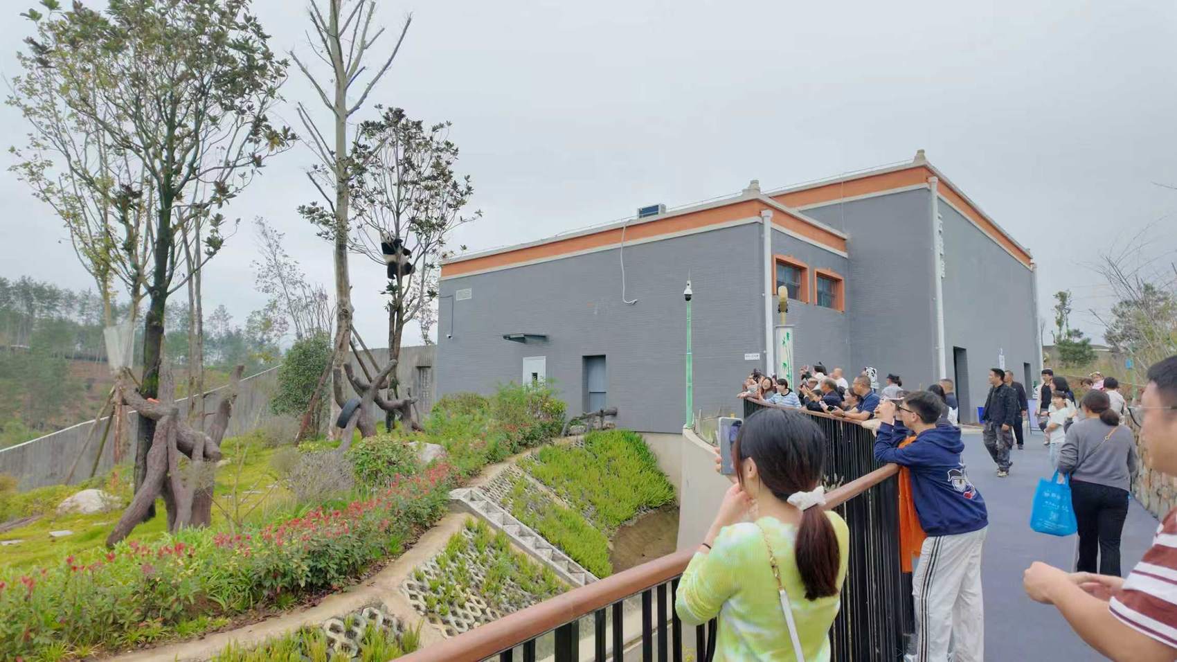 游客在大熊猫动植物园与熊猫互动。