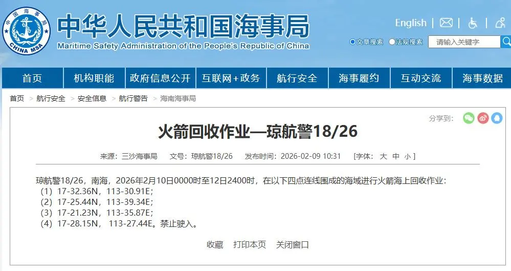 据中国海事局网站消息,三沙海事局发布航行警告,2月10日0时至12日24时,南海部分海域进行火箭海上回收作业,禁止驶入。