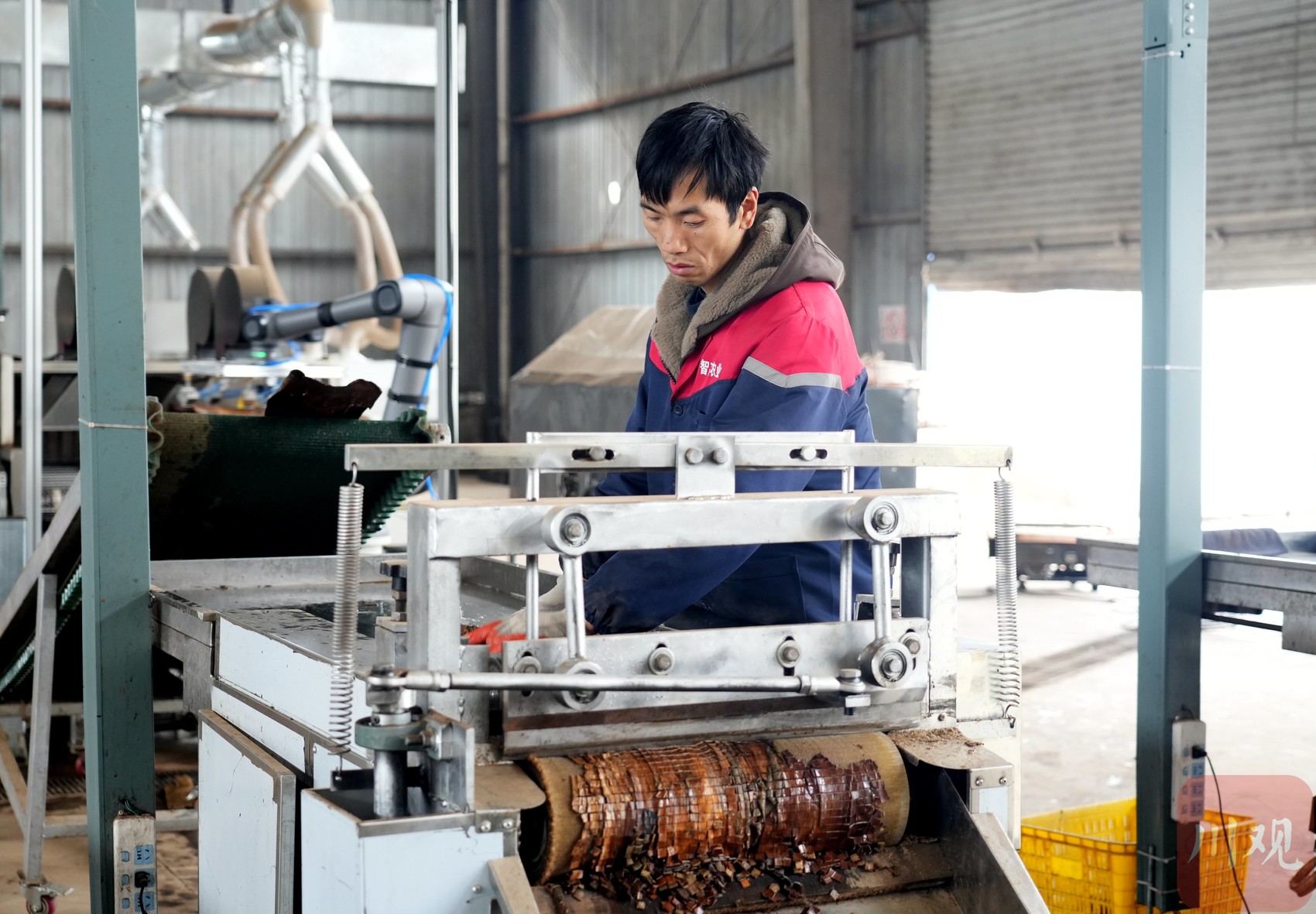 早上八点半,操作员汪攀在控制电脑前轻点启动,一张张杜仲皮整齐列队,依次经过压平整形、自动清洗,随后被智能机械臂稳稳抓取,精准移送至数控切刀之下。刀刃规律起落间,一片片方正均匀的杜仲丁便已成形。