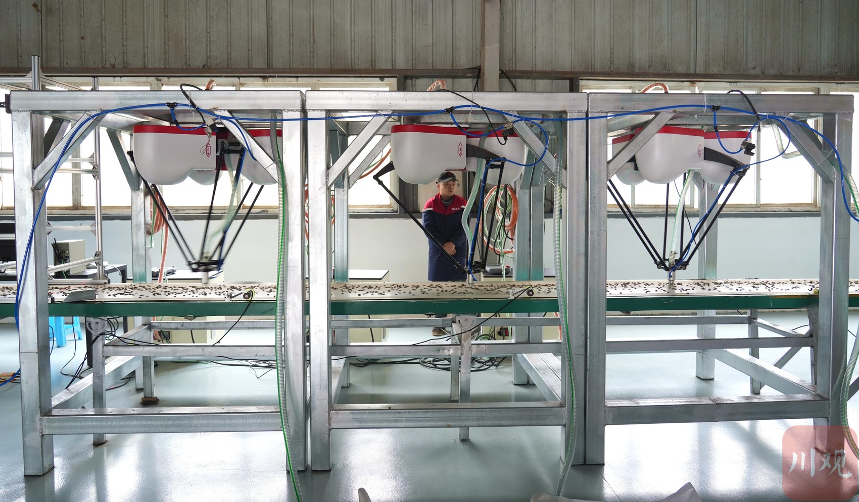 厚度检测系统中正在吸取厚度不足3mm杜仲丁的蜘蛛机械臂。