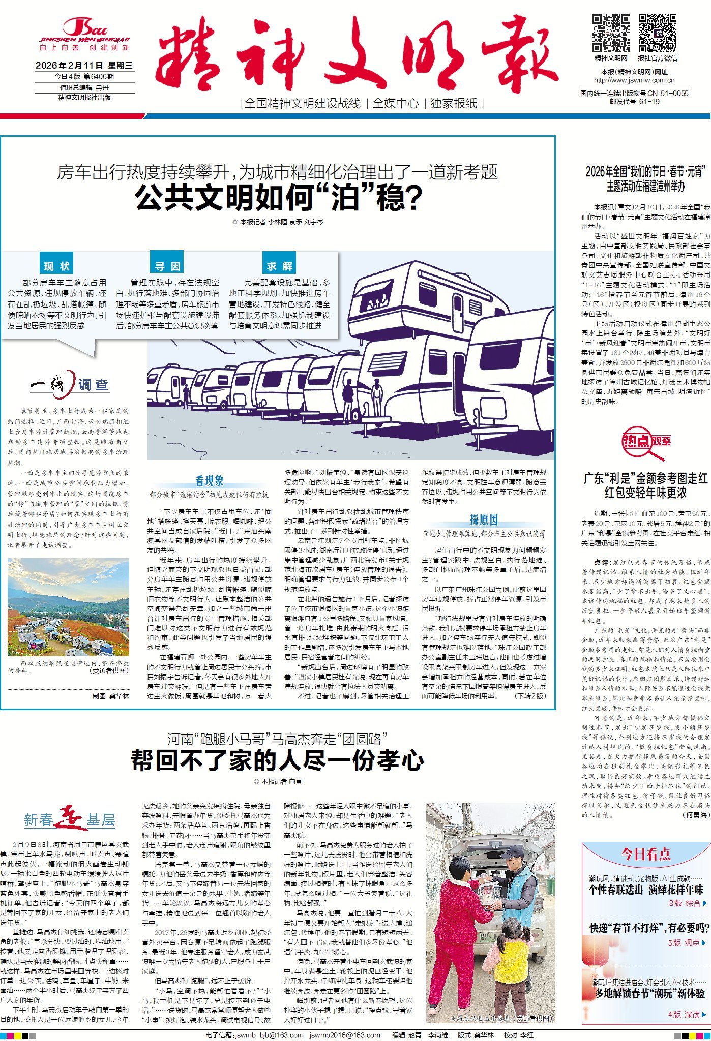 春节将至,房车出行热度持续攀升,一场围绕房车的“停”与城市管理的“管”之间的拉锯展开,为城市精细化治理出了一道新考题。如何在实现房车出行有效治理的同时,引导广大房车车主树立文明出行、规范旅居的理念?请关注今日1版《一线调查》。