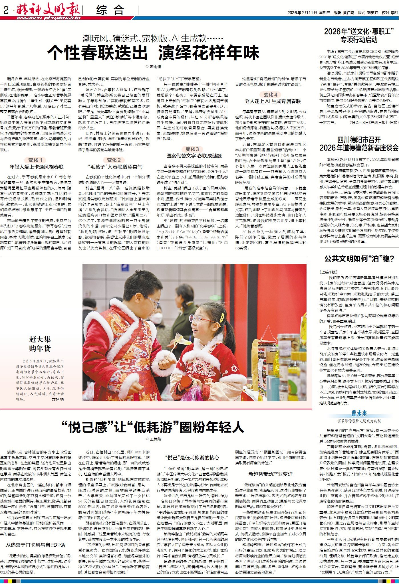 千百年来,春联这种红纸黑字的方正对句形式,始终是中国人辞旧迎新不可或缺的文化符号。它张贴于千家万户的门楹,承载着驱邪避灾、祈福纳祥的朴素愿望,也凝结着书法艺术与汉语诗律的独特美感。如今,潮玩风、猜谜式、宠物版、AI生成款的马年春联,内容和形式不断更新,既增添年味又彰显个性表达。一起来今日“综合”版头条,看个性春联如何演绎花样年味。