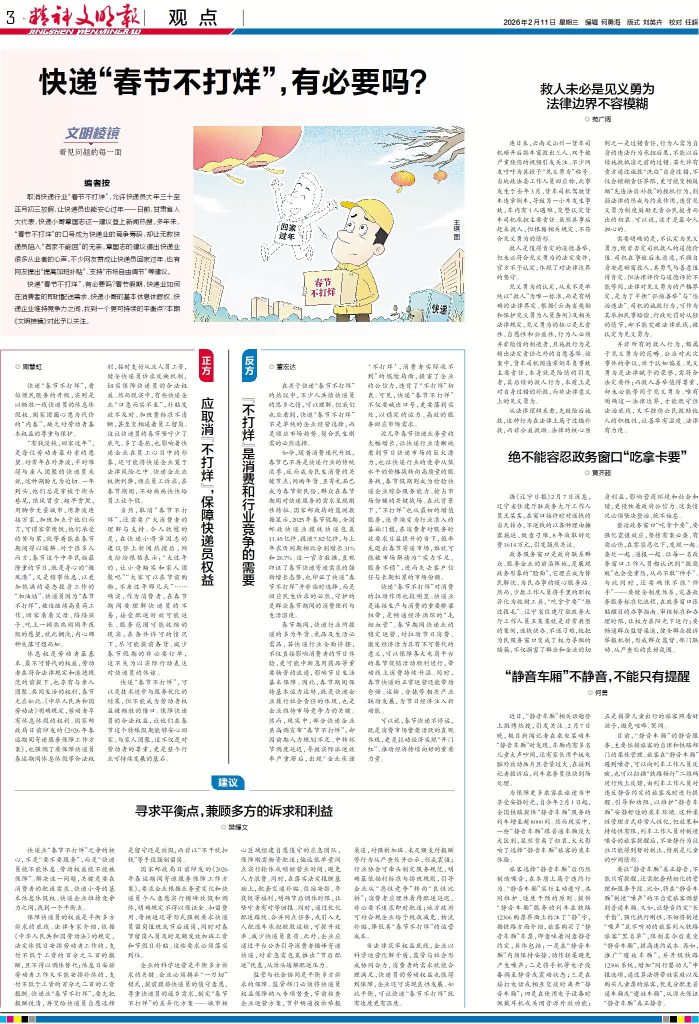 近日,甘肃省人大代表、快递员章国志的一条建议登上热搜——取消快递“春节不打烊”,让快递员大年三十至正月初三放假。多年来,快递“春节不打烊”让无数快递员难以回家过年,章国志的建议道出从业者的心声。那么,快递“春节不打烊”是否必要?春节假期,快递业如何在消费者需求、快递员权益与企业竞争力间找到平衡?本期《文明棱镜》特此关注这一议题,一起来看多方观点。
