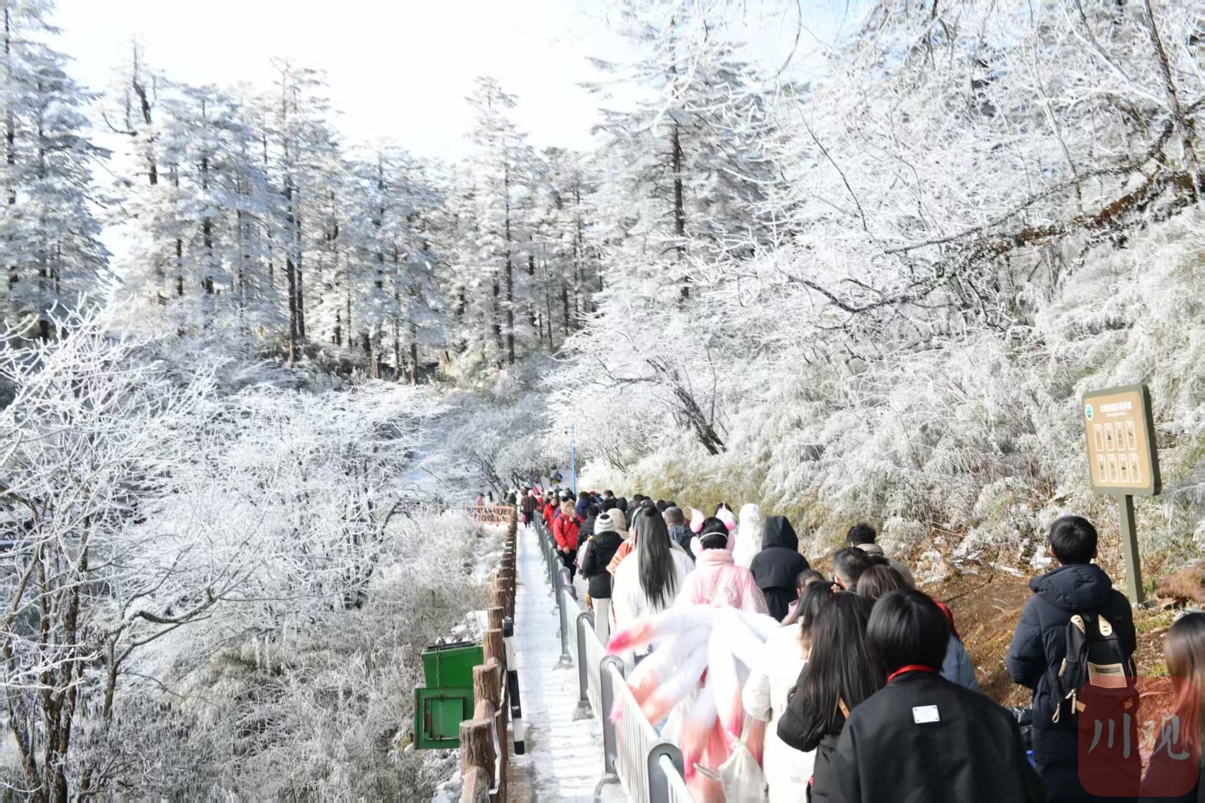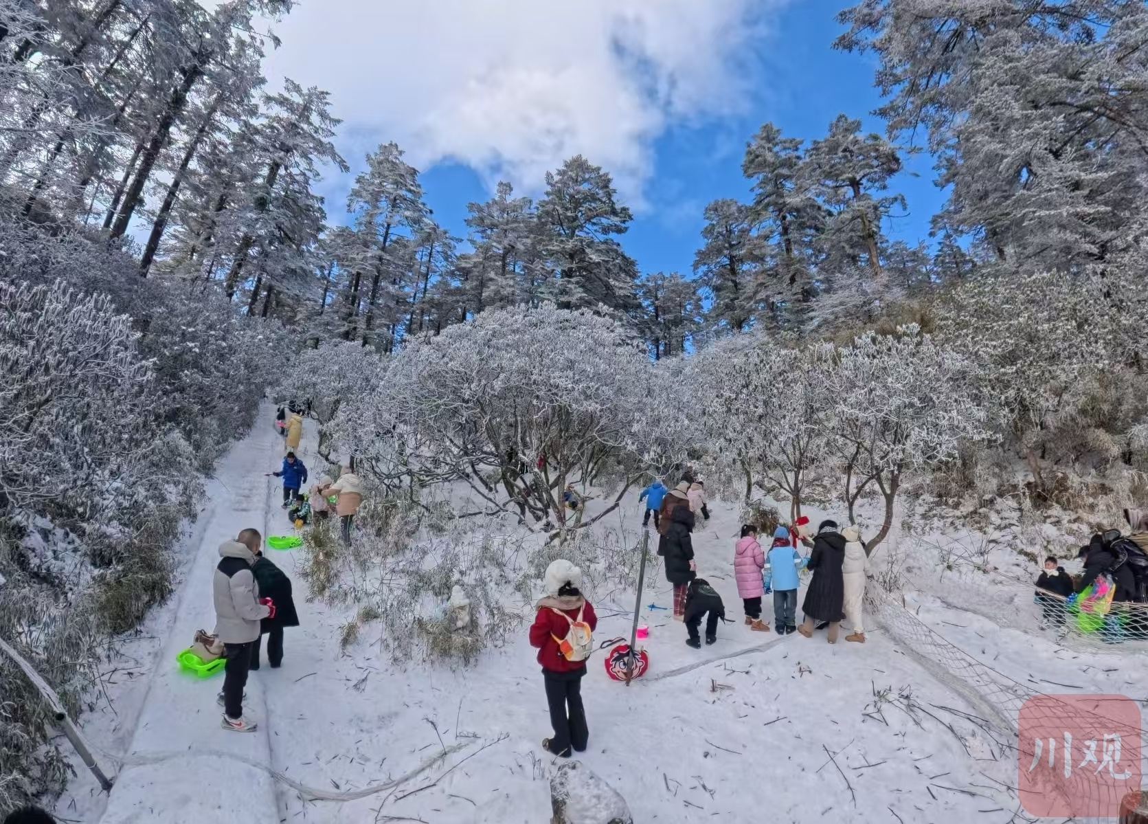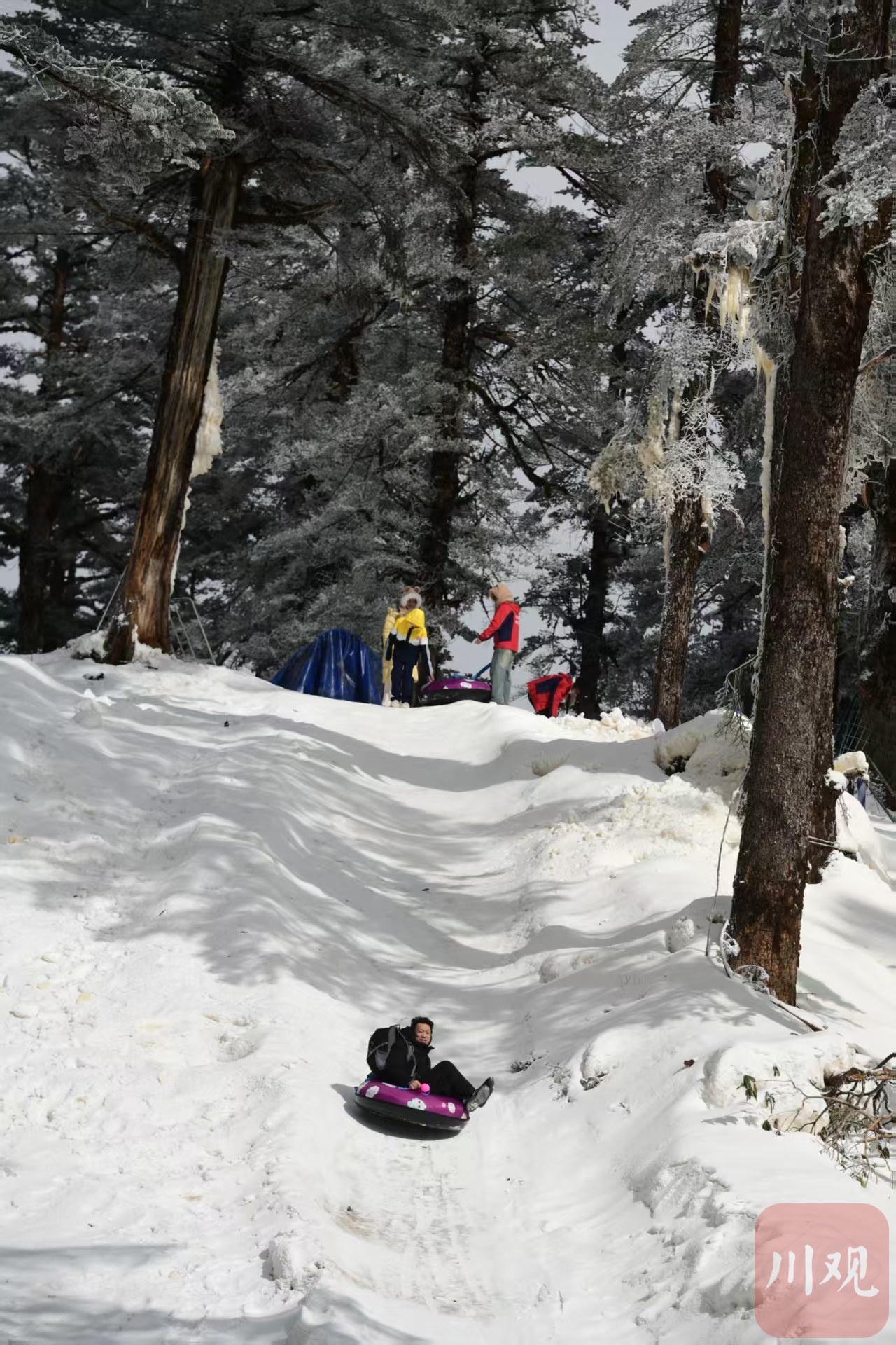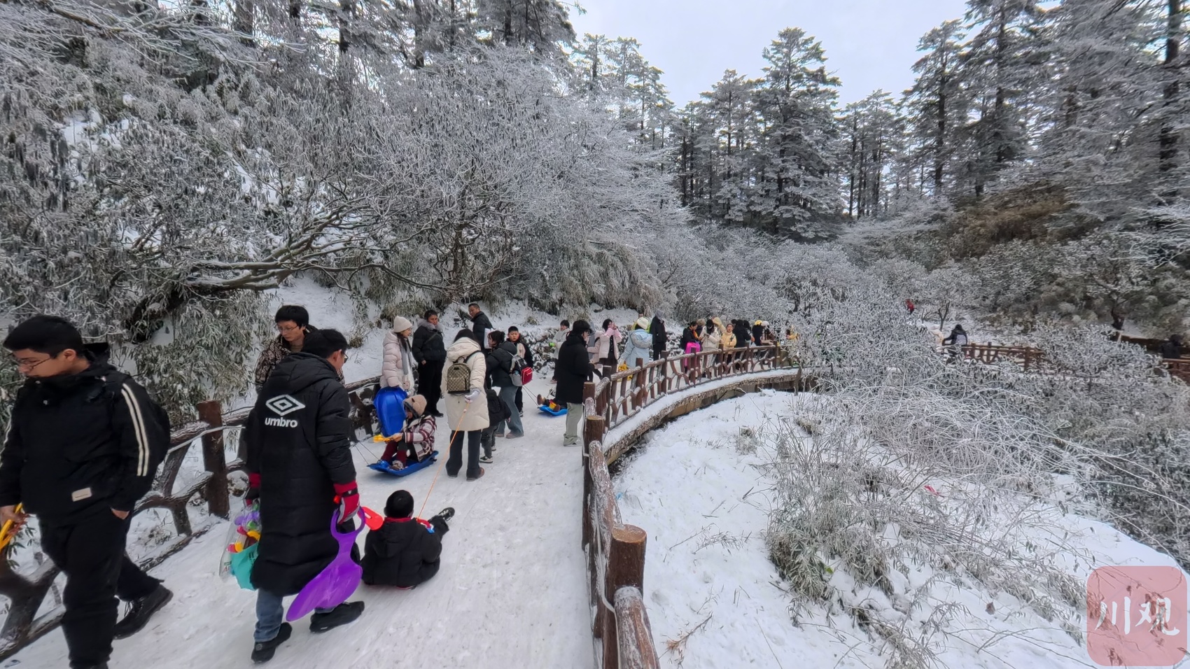 “知道人会很多,所以我们赶早。”黄梓萱的父亲说。爬山、乘索道、一路游玩,他们成为当天首拨抵达山顶的游客。“娃娃第一次见到这么厚的雪,耍得特别开心。”