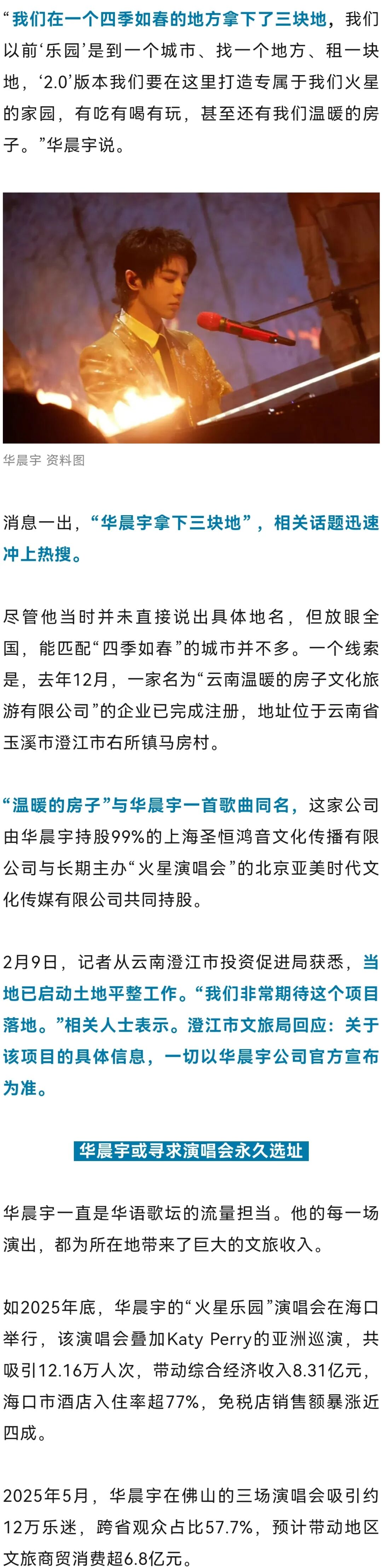 2月8日晚,歌手华晨宇在演唱会现场发布一则重磅消息: