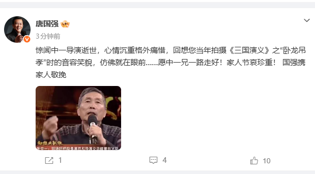 2月10日,唐国强发文悼念张中一:惊闻中一导演逝世,心情沉重格外痛惜,回想您当年拍摄《三国演义》之“卧龙吊孝”时的音容笑貌,仿佛就在眼前……愿中一兄一路走好!家人节哀珍重! 国强携家人敬挽。