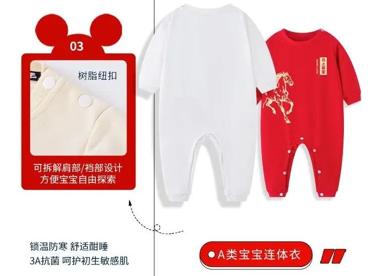 小码爬行服特别设计了可拆解的肩部与裆部,方便穿脱和活动。