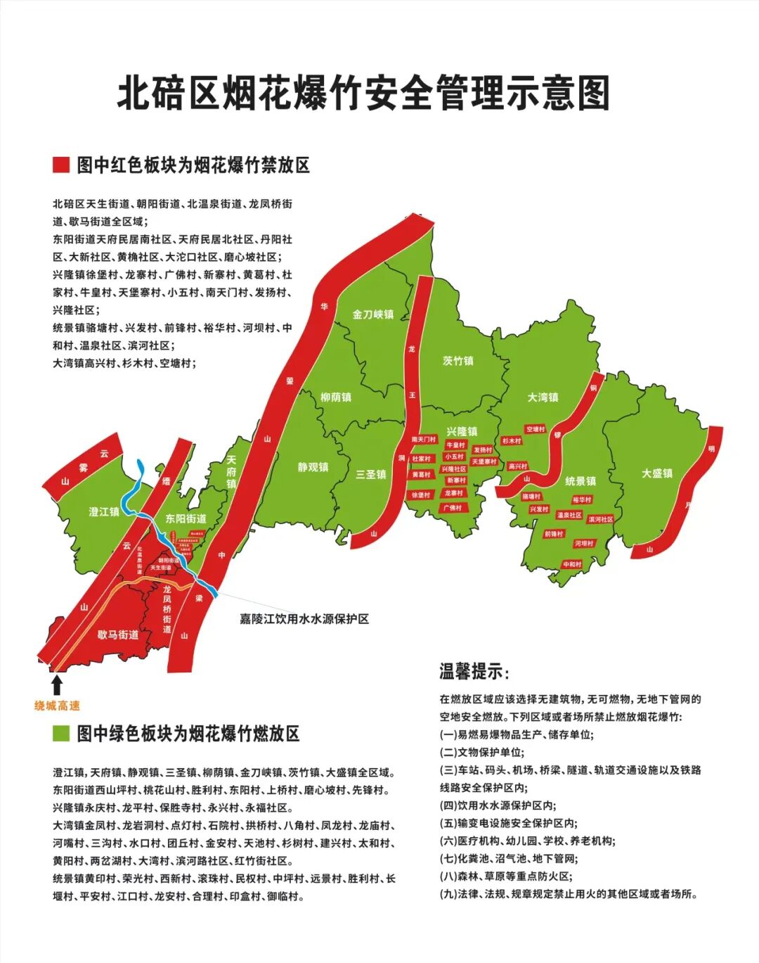据介绍,2026年重庆中心城区可以燃放烟花爆竹的区域主要集中在北碚区、两江新区、巴南区,具体区域为: