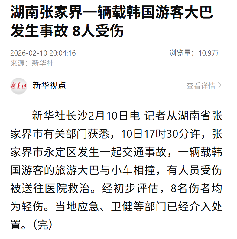 据新华社消息,记者从湖南省张家界市有关部门获悉,10日17时30分许,张家界市永定区发生一起交通事故,一辆载韩国游客的旅游大巴与小车相撞,有人员受伤被送往医院救治。