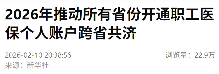 据新华社2月10日消息,国家医保局2月10日发布医保领域“高效办成一件事”2026年度第一批重点事项清单,其中明确,所有省份开通职工医保个人账户跨省共济。