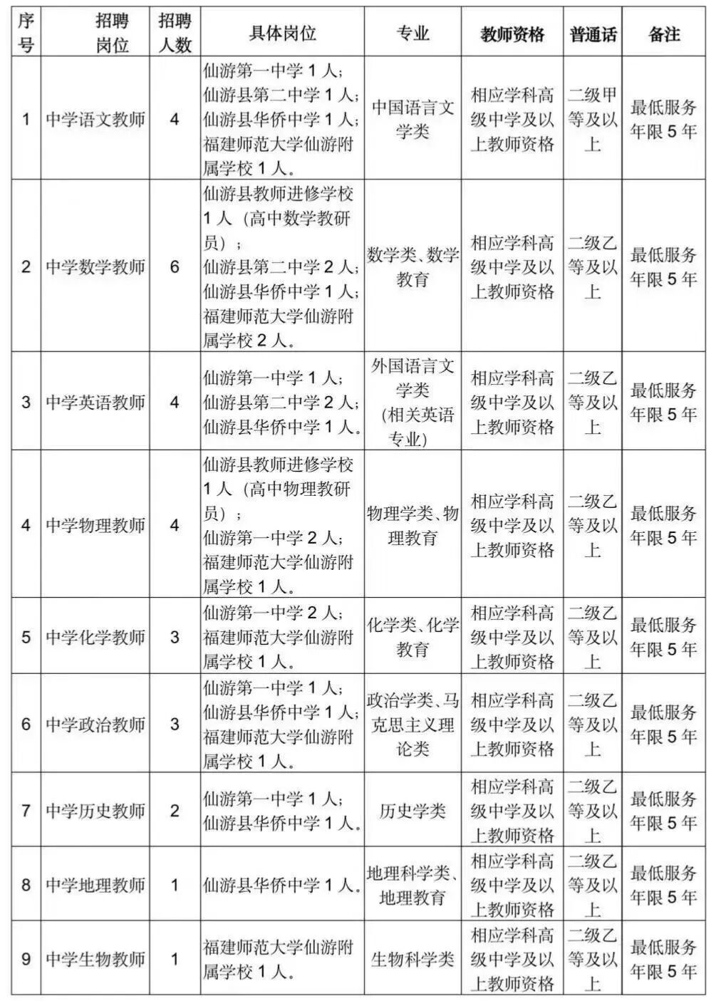 莆田市仙游县2026年考核招聘中学新任教师方案