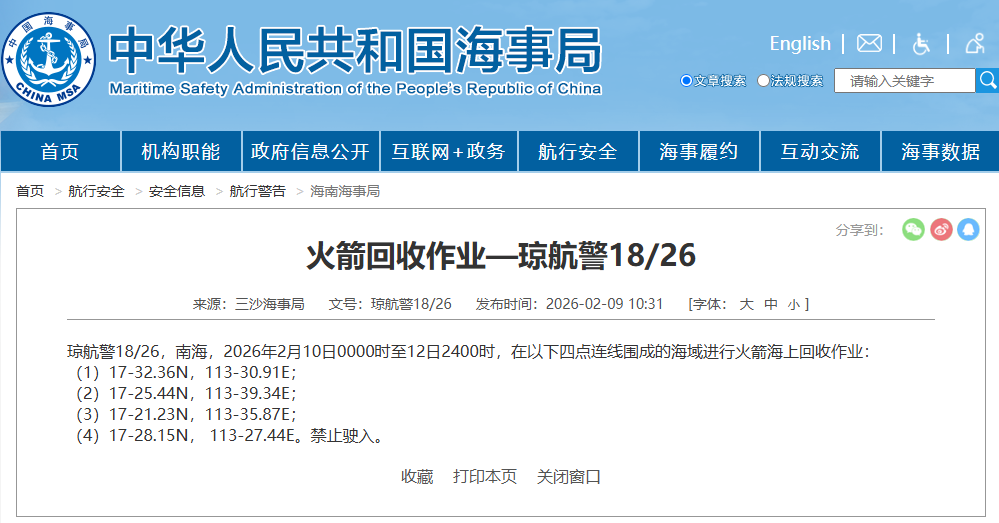 据中国海事局网站消息,三沙海事局发布航行警告,2月10日0时至12日24时,南海部分海域进行火箭海上回收作业,禁止驶入。