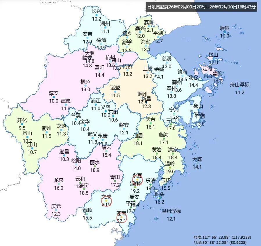 处于升温通道中,白天气温再度攀升,尤其是浙南地区,在阳光的助力下,暖意融融,苍南、文成、永嘉甚至翻越了20℃线,其中最高的苍南达到了22.1℃。