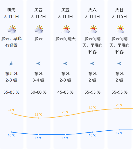 11-12日大致多云,其中12日偏东风清劲,气温略降;