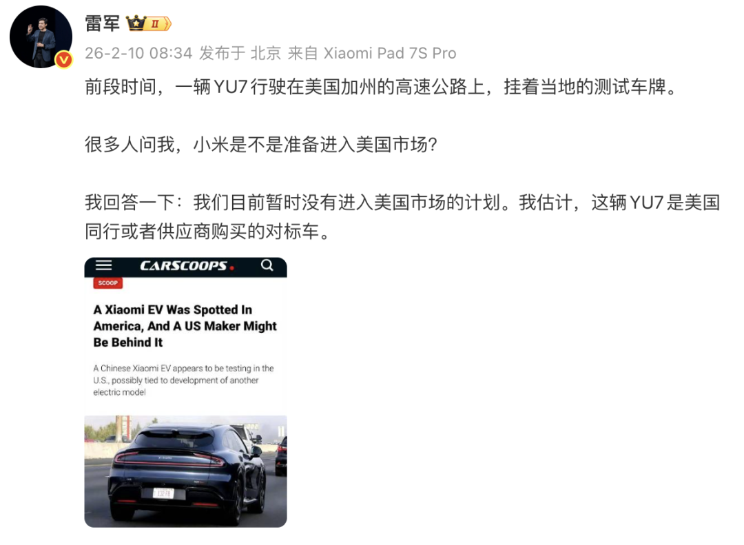 2月10日,小米创办人,董事长兼CEO雷军在微博发文表示,前段时间,一辆YU7行驶在美国加州的高速公路上,挂着当地的测试车牌。