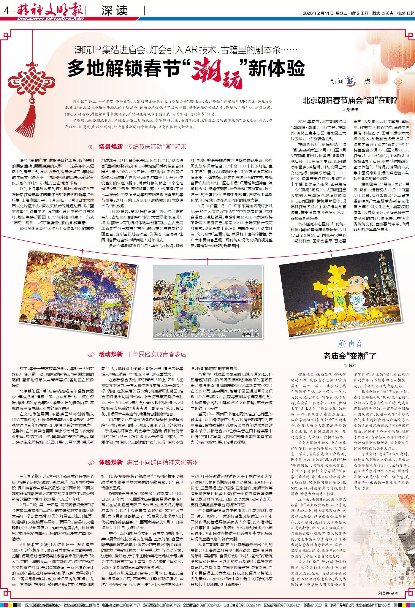 从北京朝阳“潮”庙会让京味非遗走出尘封的展馆,到上海豫园灯会以“潮流语言”重新演绎传统年味,再到四川自贡灯会以“科技+互动”打造沉浸式体验场景……各地的实践都证明,年味不仅是记忆,更是创造;传统不仅有守护,更有新意。当千年民俗遇上时尚表达,传统文化便有了跨越时光的穿透力,在代代相传中焕发新生。(综合《北京日报》、上观新闻、澎湃新闻等)