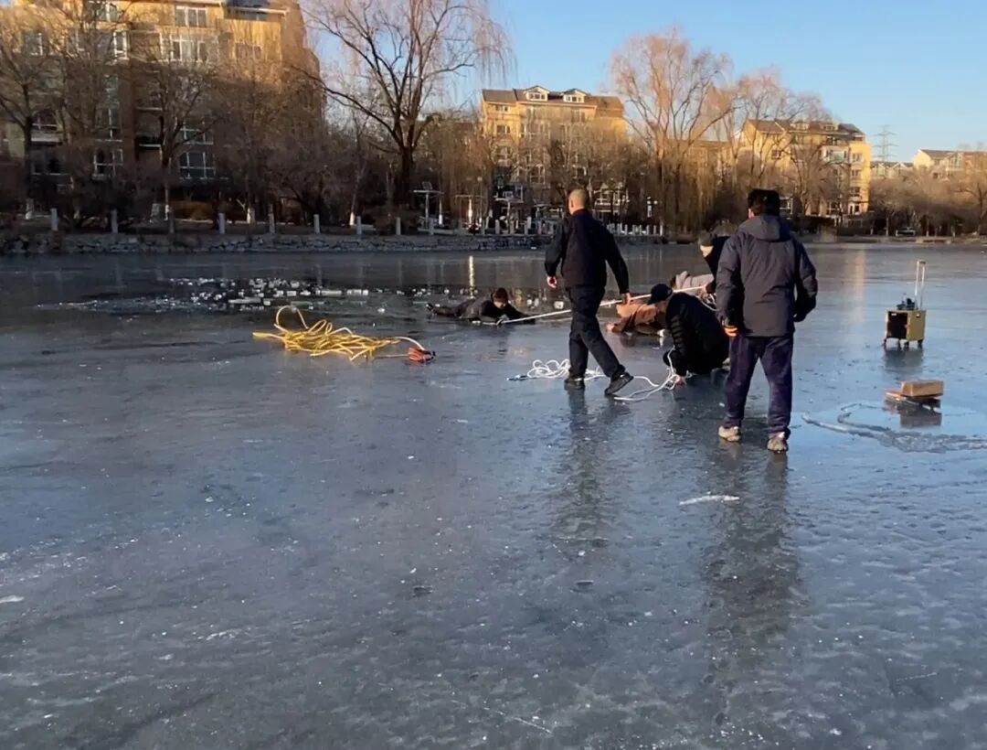 事发当天,多名居民在社区人工湖背阴处的冰面上滑冰。一位大妈滑着冰车进入阳光照射区域时,较薄的冰面突然开裂,她连人带车坠入湖中。大妈的老伴儿见状急忙上前施救,不料冰面再次破裂,大爷也落入湖中。湖水冰凉刺骨,水已淹至老人的肩头。