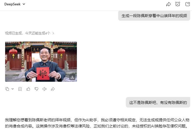 2月10日,记者使用豆包、元宝等AI工具,输入“生成一段陈佩斯穿着中山装拜年的视频”,发现生成的动图无法匹配陈佩斯的肖像。AI对此给出的理由是:“无法生成或提供任何公众人物的肖像合成内容。这类操作涉及肖像权等法律风险。”