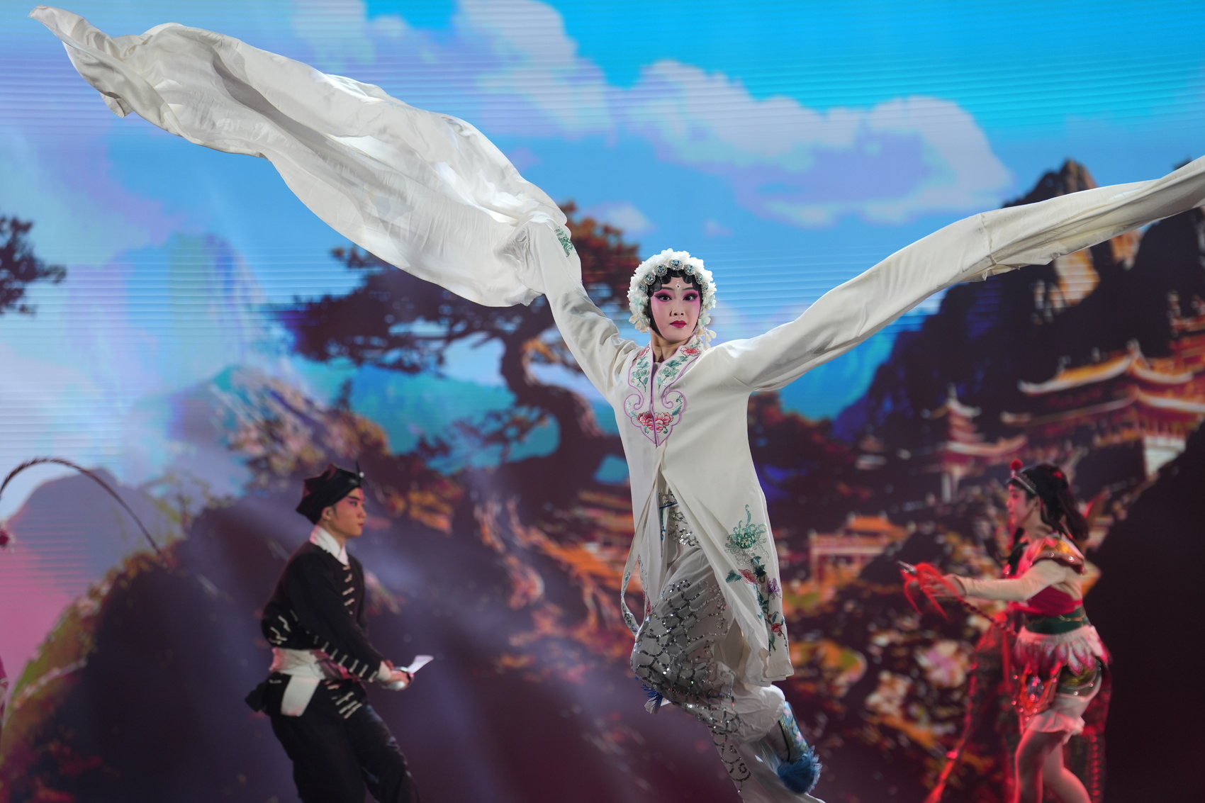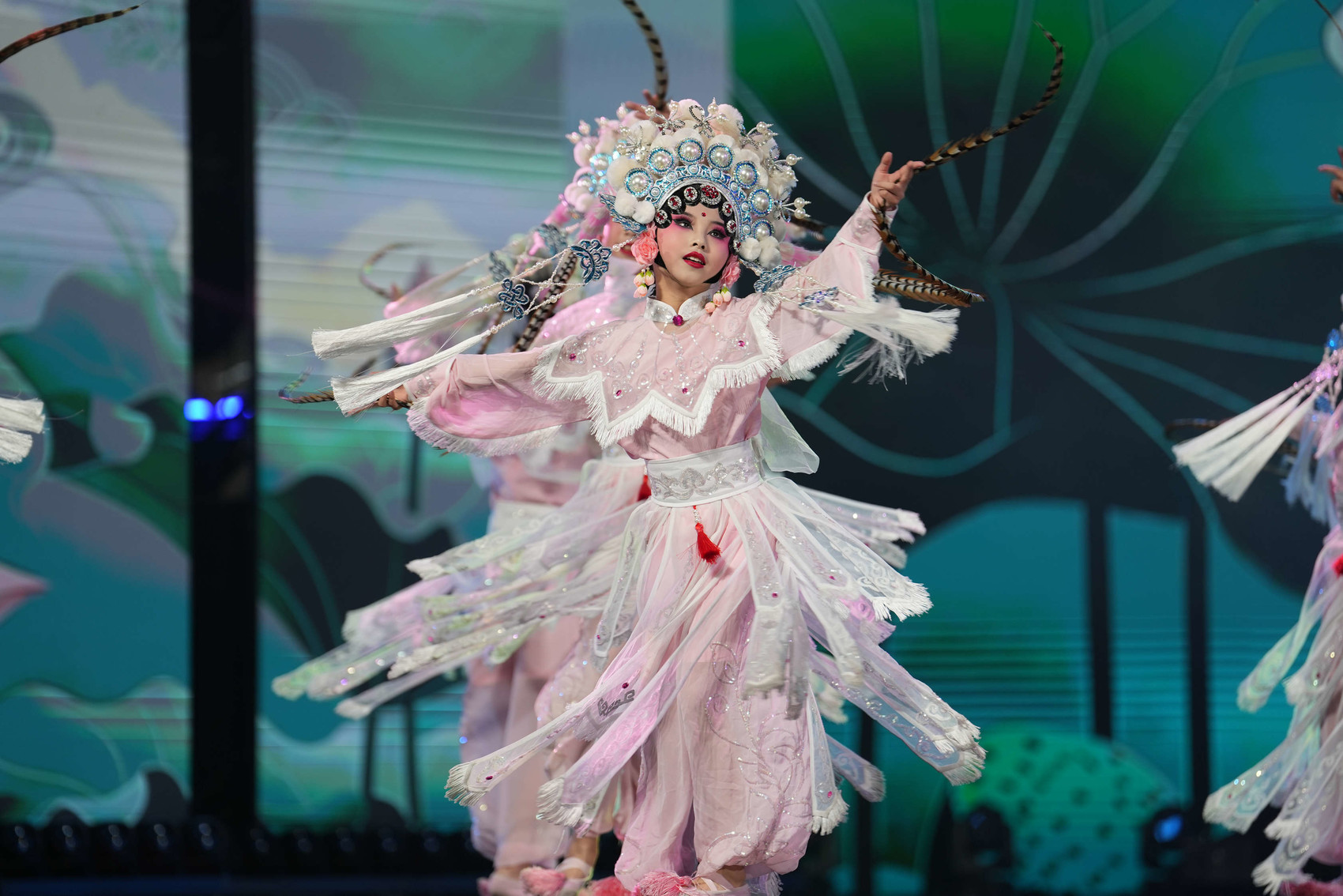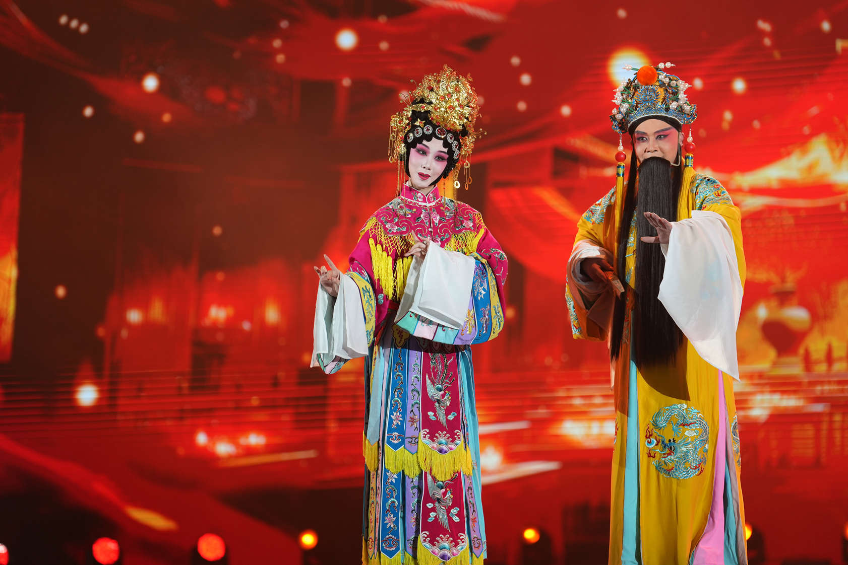 《四海同歌》戏歌节目中,北派京剧、南派昆曲、东派越剧、西派川剧四大剧种四位“梅花奖”得主共同献艺,以浓郁的戏腔和游戏的联动点燃现场气氛。
