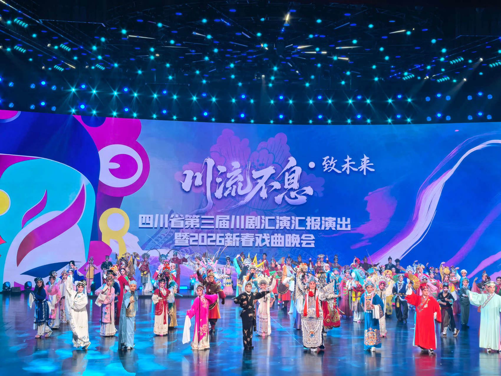 2月10日晚,“川流不息·致未来”四川省第三届川剧汇演汇报演出暨2026新春戏曲晚会在成都市东安湖大剧场举行。作为全省川剧艺术年度盛会,本次汇报演出汇聚汇演精品,既彰显川剧传统底蕴与创新活力,也以视听盛宴为新春增添浓郁巴蜀戏韵。