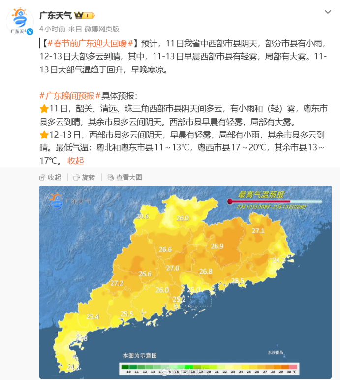广东省气象台预计,2月11日广东中西部市县阴天,部分市县有小雨。2月12日—13日广东大部多云到晴。其中,2月11日—13日早晨广东西部市县有轻雾,局部有大雾。2月11日—13日广东大部气温趋于回升,早晚寒凉。