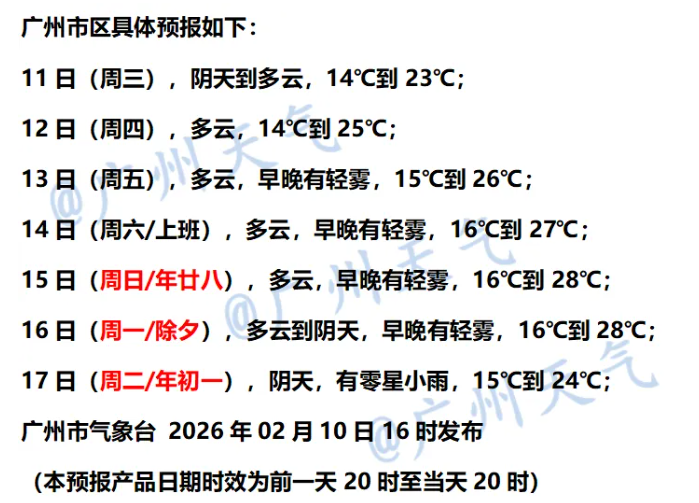 广州市气象台预计,2月11日广州阴天到多云,北部有零星小雨。2月12日—14日广州以多云为主,气温逐渐回升,最高气温介于26~28℃。15—16日白天受低槽发展影响,多云间阴天,早晚有轻雾。16日夜间至18日(除夕至初二)受新一股冷空气补充影响,气温再次下降,或伴有弱降水。
