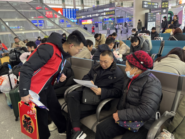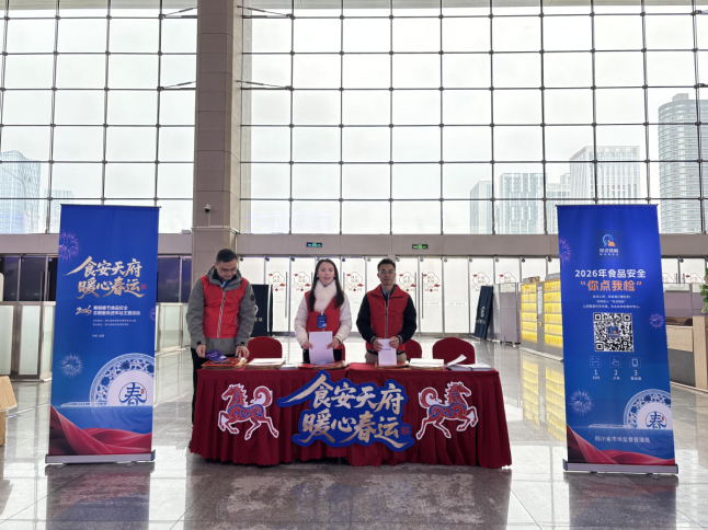 2月9日上午,成都东站候车大厅人潮涌动,归心似箭的旅客们提着大包小包的年货,满载一年的收获与思念奔赴团圆之旅。在这片繁忙与温情交织的春运图景中,一抹亮眼的“志愿红”悄然点亮车站。由省食安办主办、省食检院承办的“食安天府,暖心春运”食品安全志愿服务活动在此开展,为返乡旅客送上了一份别样的“年味”。