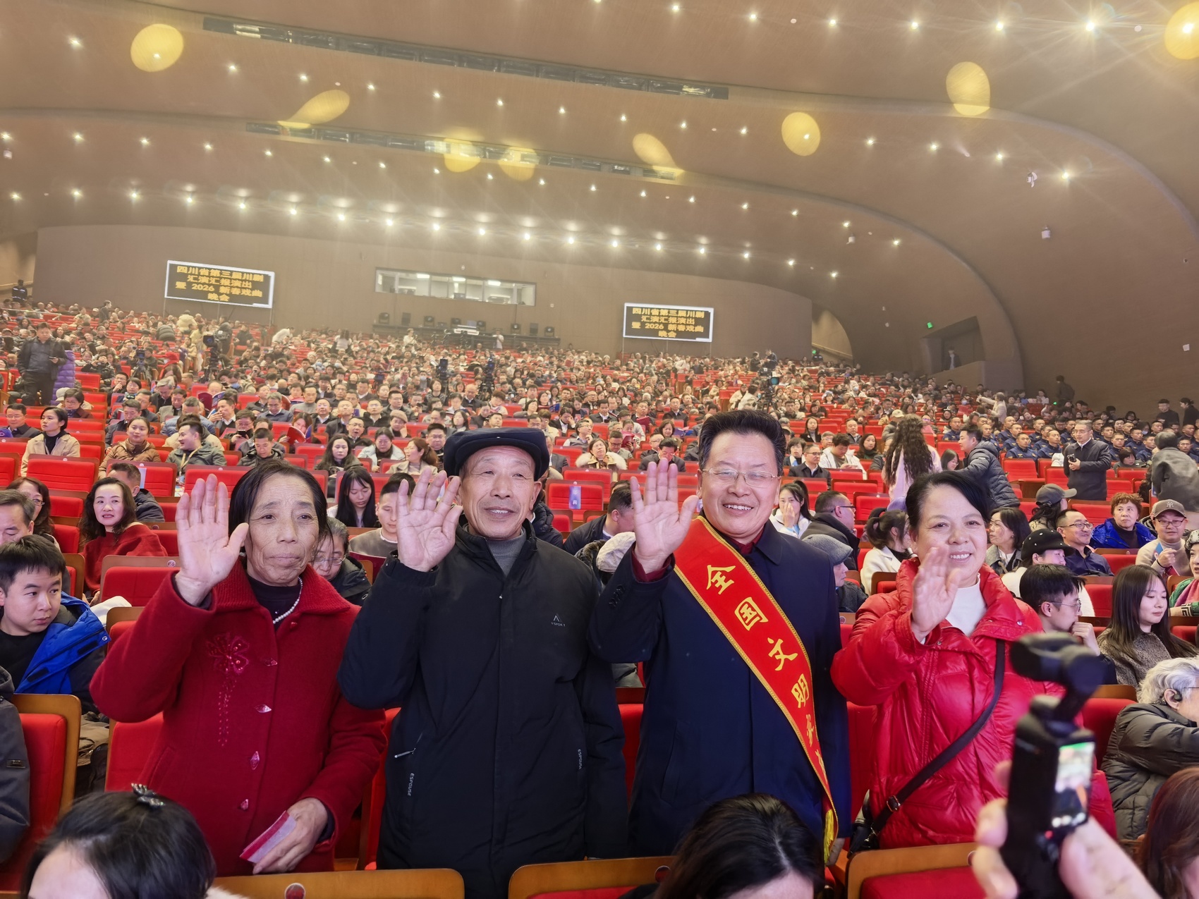2月10日晚,成都市东安湖大剧场锣鼓铿锵、戏韵飞扬,四川省第三届川剧汇演汇报演出暨2026新春戏曲晚会在此举行。全国文明家庭卢廷俊家庭、四川省道德模范王从亮、成都市道德模范何小伊、成都市“平凡之善”代表郭小林等20名先进典型及家属代表受邀到场,共赏川剧雅韵,共享城市专属礼遇。