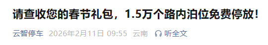 据了解,云南云智城市服务有限责任公司、昆明市智慧停车建设运营有限公司管理的昆明主城区314条道路,1.5万个道路临时停车泊位,将在2026年春节期间实行免费停放。